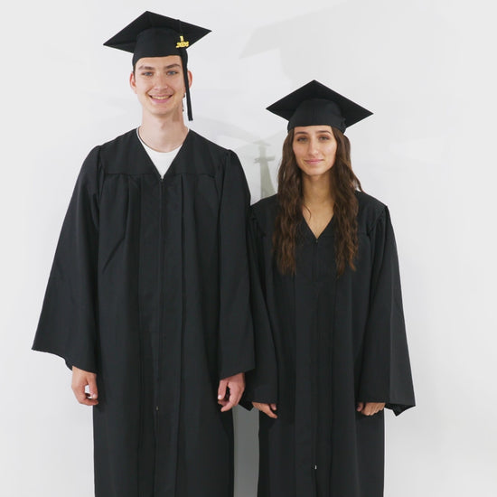 Black Elementary School Graduation Cap, Gown & Tassel Packs. Canadian Gowns offers a complete line of discount graduation apparel that you can order individually and to make your life easier we have put together the graduation cap, gown and tassel packs which come in a variety of colours and sizes to fit all elementary school graduates. The classic black cap and gown ideally traditional for your graduation ceremony. Each black gown and cap is made from best quality tricot fabric, and styled to fit comfortably. The black graduation gown is designed with front strong pleats and darted yoke. The graduation cap mortarboard is 9.4"sq and made with flexible elastic for a 'one size fits all'. The cap tassel comes with a free current year charm to symbolize the year of accomplishment. You can pick the colour tassel of your preference from a wide variety of Canadian Gowns colours as part of the graduation pack. Huge graduation savings on graduation wear are offered for bulk orders.